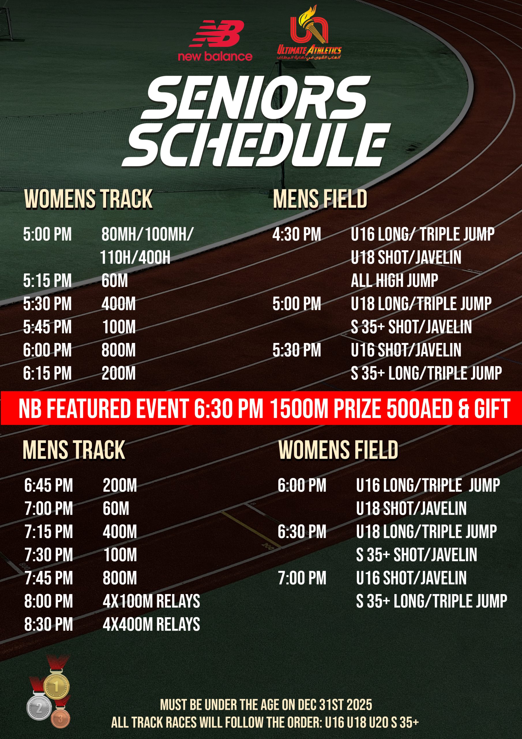 Join us for another fantastic series of Ultimate Racenight Track & Field Open Competitions! These meets are powered by World Athletics approved Lynx Electronic Timing. Supported by the Dubai Sports Council, Abu Dhabi Sports Council, New Balance, Up and Running, Monviso and Kibsons. A Great Atmosphere, medals and prizes ensure these events are a highlight of our season for sure! Top athletes are selected for the UAE Athletics federation club meets, International Meets such as the World Youth Games.